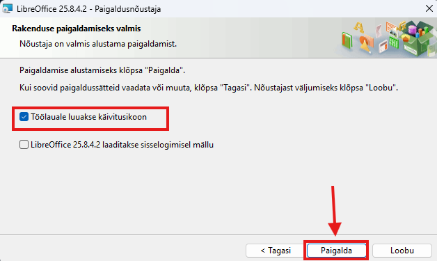 4. Soovitame klõpsata aktiivseks (Töölauale luuakse käivitusikoon) funktsioon, siis ilmud töölaule LibreOffice ikoon ja hiljem on lihtsam rakendust käivitada. Peale seda klõpsake klahvile paigalda.